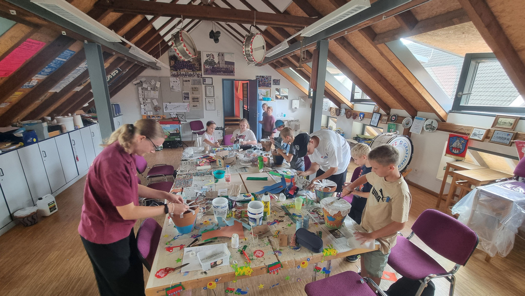 23.08.2025 - Im Rahmen des Ferienprogrammes der Gemeinde konnten Kinder von 8 bis 10 Jahren kreativ werden: Dazu hatte unser Jugendwart Jan Eisfeld mit seinem Team den Vereinsraum kurzerhand zur kreativen Instrumentenwerkstatt umfunktioniert.